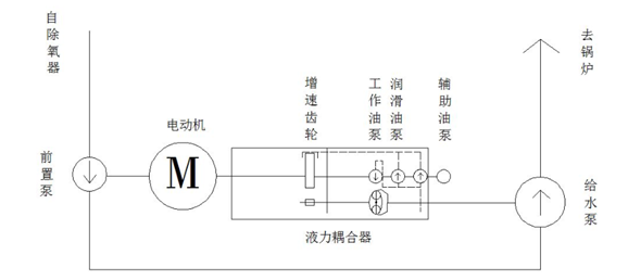 系統(tǒng)由前置泵、電動機(jī)、液力偶合器(包含工作油路、潤滑油路部分)、給水泵組成,系統(tǒng)根據(jù)機(jī)組負(fù)荷變化,通過液力偶合器調(diào)節(jié)給水泵供水量的大小,以滿足鍋爐生產(chǎn)系統(tǒng)供水量的需要。