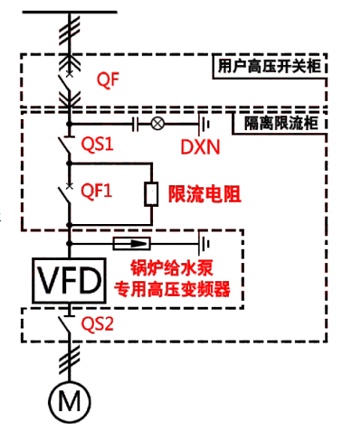 希望森蘭為鍋爐電動(dòng)給水泵拖動(dòng)系統(tǒng)電動(dòng)機(jī)配置的是給水泵專用變頻調(diào)速系統(tǒng)。系統(tǒng)針對(duì)鍋爐給水泵運(yùn)行的特點(diǎn)和要求設(shè)計(jì),完全符合鍋爐給水泵的運(yùn)行特點(diǎn)。系統(tǒng)一次主回路方案選取一拖一帶限流柜方案,滿足系統(tǒng)穩(wěn)定運(yùn)行要求的同時(shí)消除了高壓上電時(shí)對(duì)系統(tǒng)的沖擊。