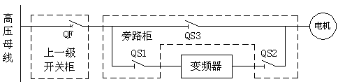 3、QS1、QS2閉合時,QS3斷開時,QF閉合時,電機由變頻器控制調速運行。QS1斷開、QS2斷開、QS3閉合時,電機可由QF直接啟停并進行保護,變頻器可完全和電網(wǎng)脫離,便于維護與檢修。