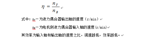 液力偶合器是通過控制工作腔內(nèi)工作油液的動(dòng)量矩變化,來傳遞電動(dòng)機(jī)能量,電動(dòng)機(jī)通過液力偶合器的輸入軸拖動(dòng)其主動(dòng)工作輪,對(duì)工作油進(jìn)行加速,被加速的工作油再帶動(dòng)液力偶合器的從動(dòng)工作渦輪,把能量傳遞到輸出軸和負(fù)載。液力偶合器有調(diào)速型和限矩型之分,前者用于電氣傳動(dòng)的調(diào)速,后者用于電機(jī)的起動(dòng)。調(diào)速型液力偶合器效率最大值為95%。液力偶合器的效率計(jì)算的公式為: